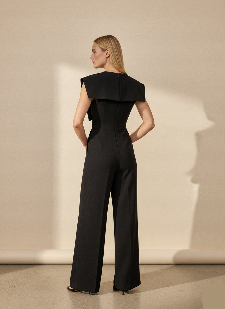 Sleeveless Wide-Leg Jumpsuit with Dramatic Cape Overlay