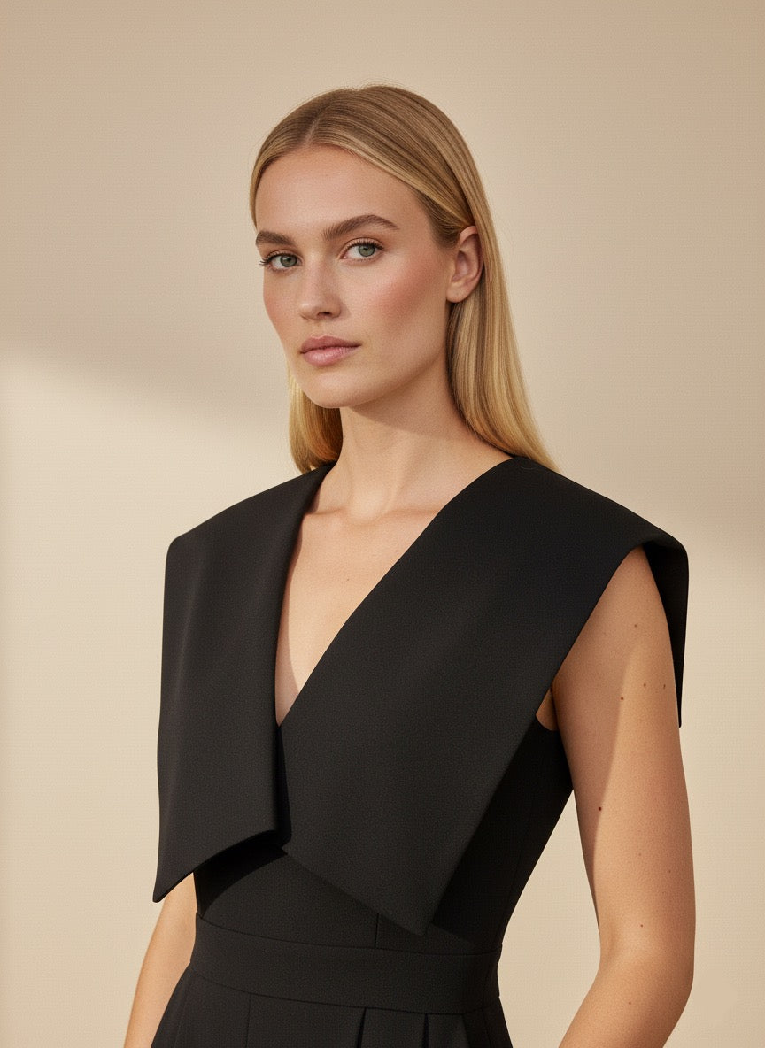 • Top Detail: Dramatic layered cape panel across the chest and shoulders